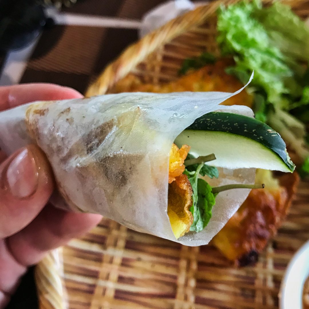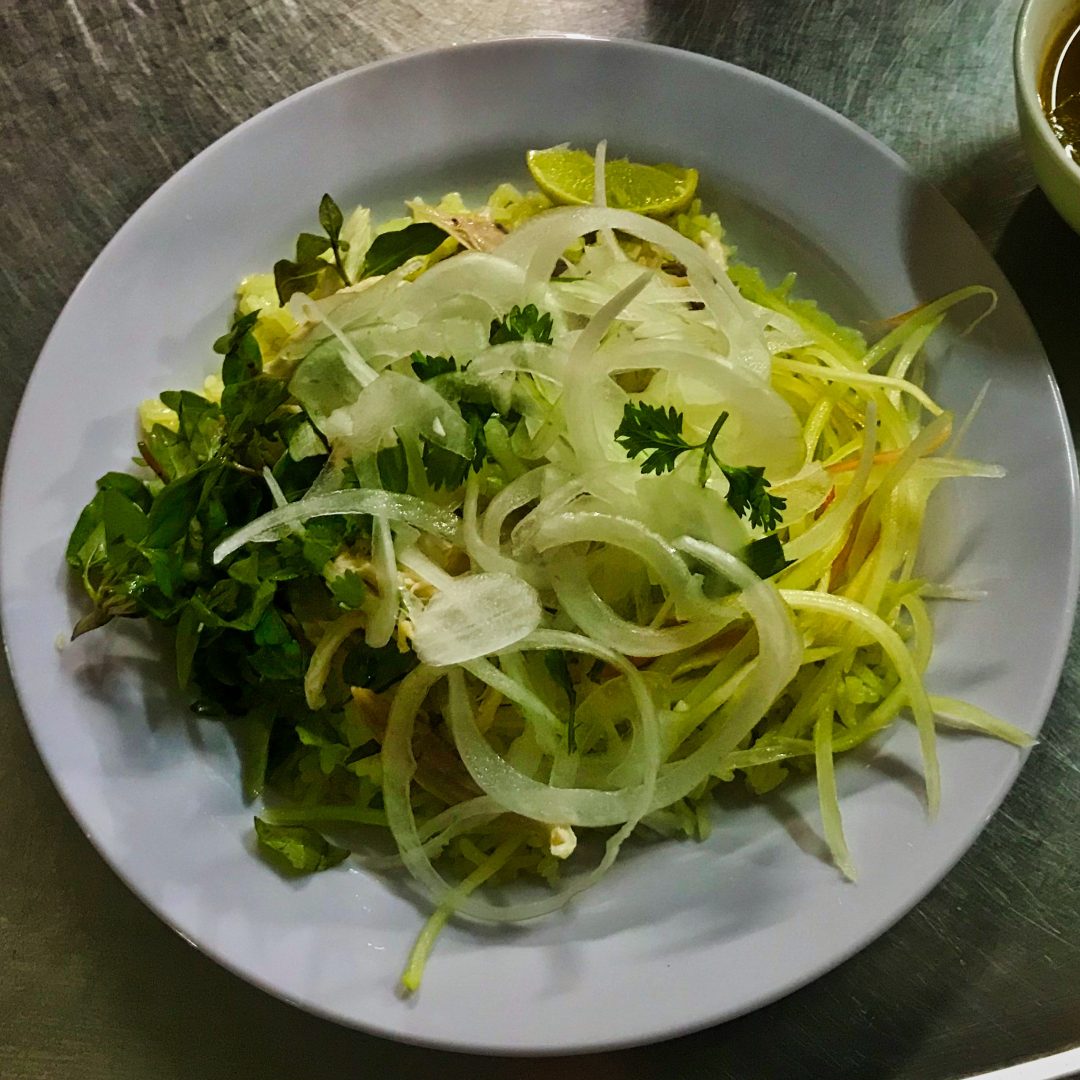 Abendessen: Com Ga. Das ist eine Spezialität in dieser Stadt. Kurkumareis mit gekochtem Huhn, Zwiebeln, grüner Papaya, Kräutern, Limette, Chilli,.. Absolut köstlich.