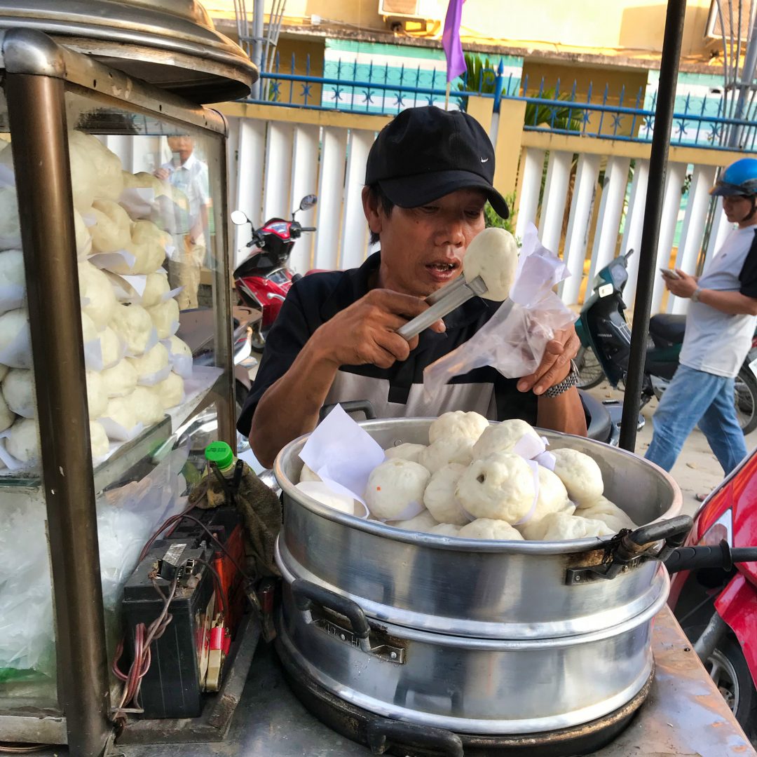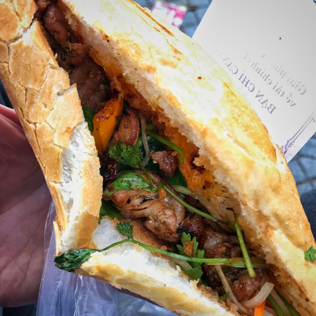 Das hier war ein ganz besonderes Bánh Mì . Gefüllt mit einem Grillspieß aus Schweinefleisch und Gemüse, extrem scharfer Soße, Kräutern und Pickles. Das klingt etwas unspektakulär, war aber geschmacklich komplex, ausgewogen und extrem süchtig machend.. Ich habe zwei Stück davon gegessen..