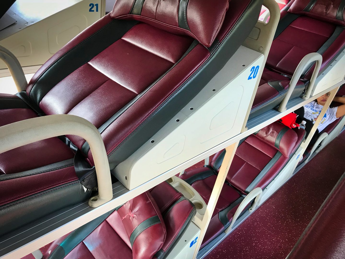 Im Sleeping-Bus von Huế nach Hội An.. Diese Schlafbusse sind wirklich witzig, in drei Reihen und zwei Etagen hat mein einen Schlafsitz, der definitiv für vietnamesische Körpergrößen gebaut wurde. Das heisst, man faltet sich irgendwie zusammen und fährt so dahin..
