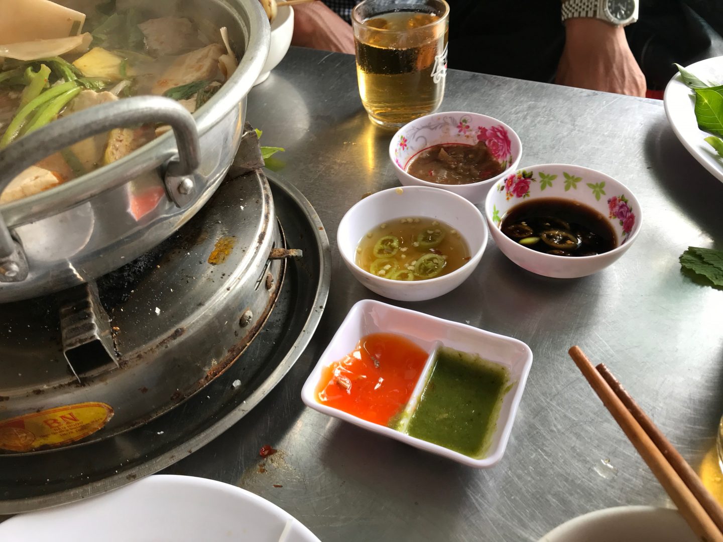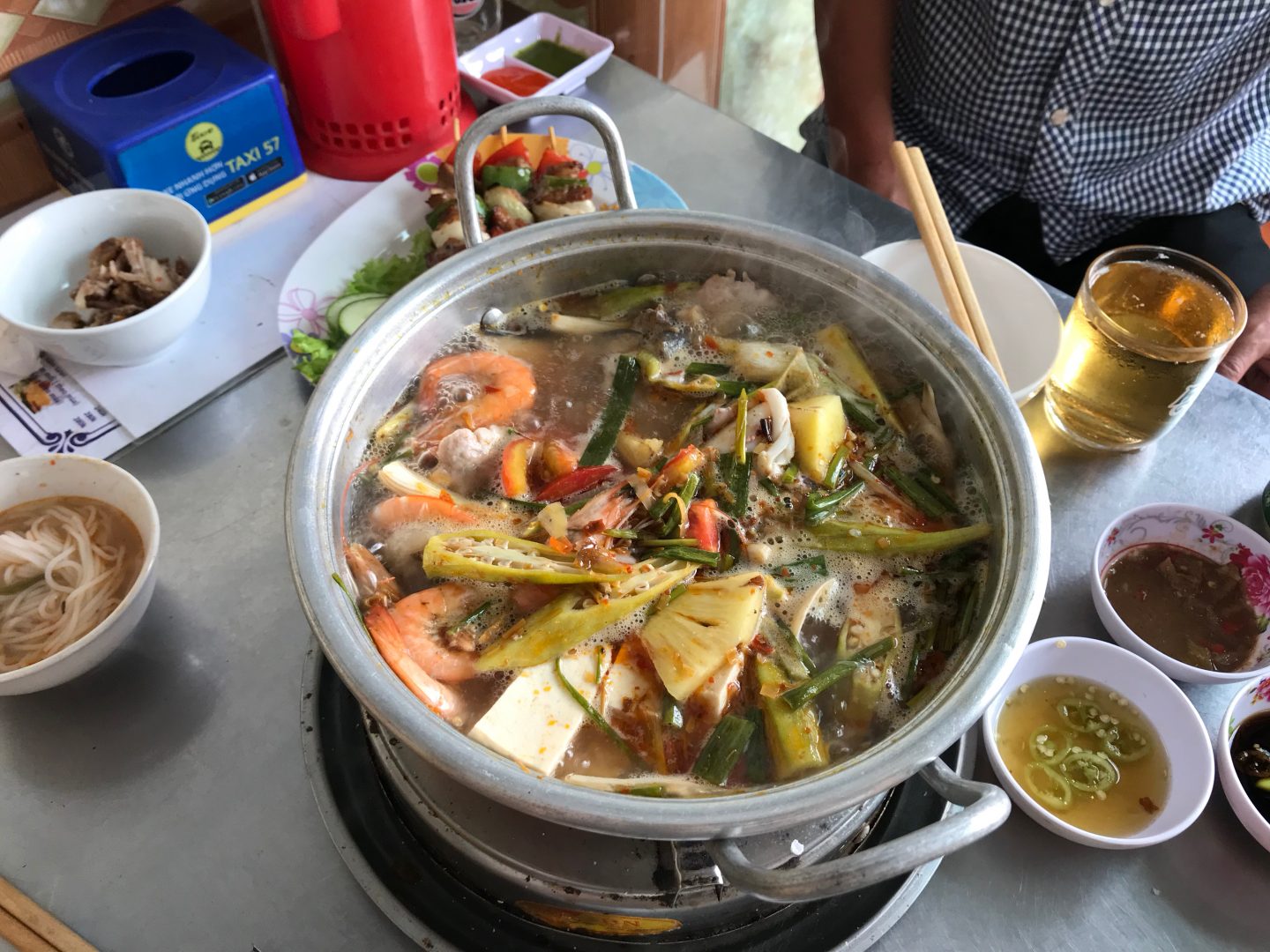 Am ersten Tag in der Kaiserstadt Huế war eigentlich mein Plan, die Zitadelle und die verbotene Stadt zu besuchen. Ich habe mir von meinem „Homestay“ ein weiteres Fahrrad ausgeliehen, mit dem ich die Stadt erkunden wollte. Allerdings stellte ich schnell fest, dass ein paar Kilometer mit einem störrischen alten Fahrrad – das anscheinend für vietnamesische Kinder gebaut wurde – bei 35 Grad ein wenig mühsam werden können. Kurz vor der Zitadelle wurde ich von einem vietnamesischen Paar von einem Moped aus angesprochen, die mein Elend anscheinend erkannt hatten.. „Hello! Where are you coming from? Germany? Ah! My Unkle lives in Berlin! Wie geht’s? Where are you going?“ Es stellte sich heraus, dass die Zitadelle gerade drei Stunden Mittagspause machte. Keine schlechte Idee eigentlich… „I finished work, come with me, let´s have lunch and drink some beer!“ Auch keine schlechte Idee. So fuhr ich mit meiner Krücke hinterher, ewig, Quer durch die Stadt. Bis er endlich anhielt. „No Tourists here. Only Locals!“ Ja, das stimmte wohl. Und so kam ich zu einem grandiosen Seafood Hotpot, Grillspießen und Bò Nướng Lá Lốt. Und natürlich Bier.