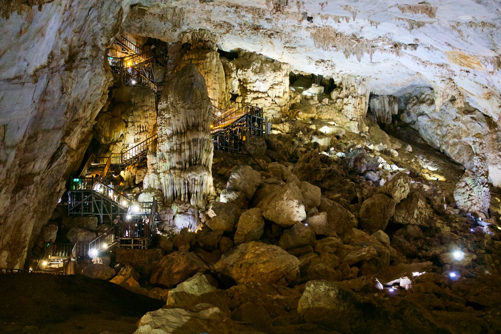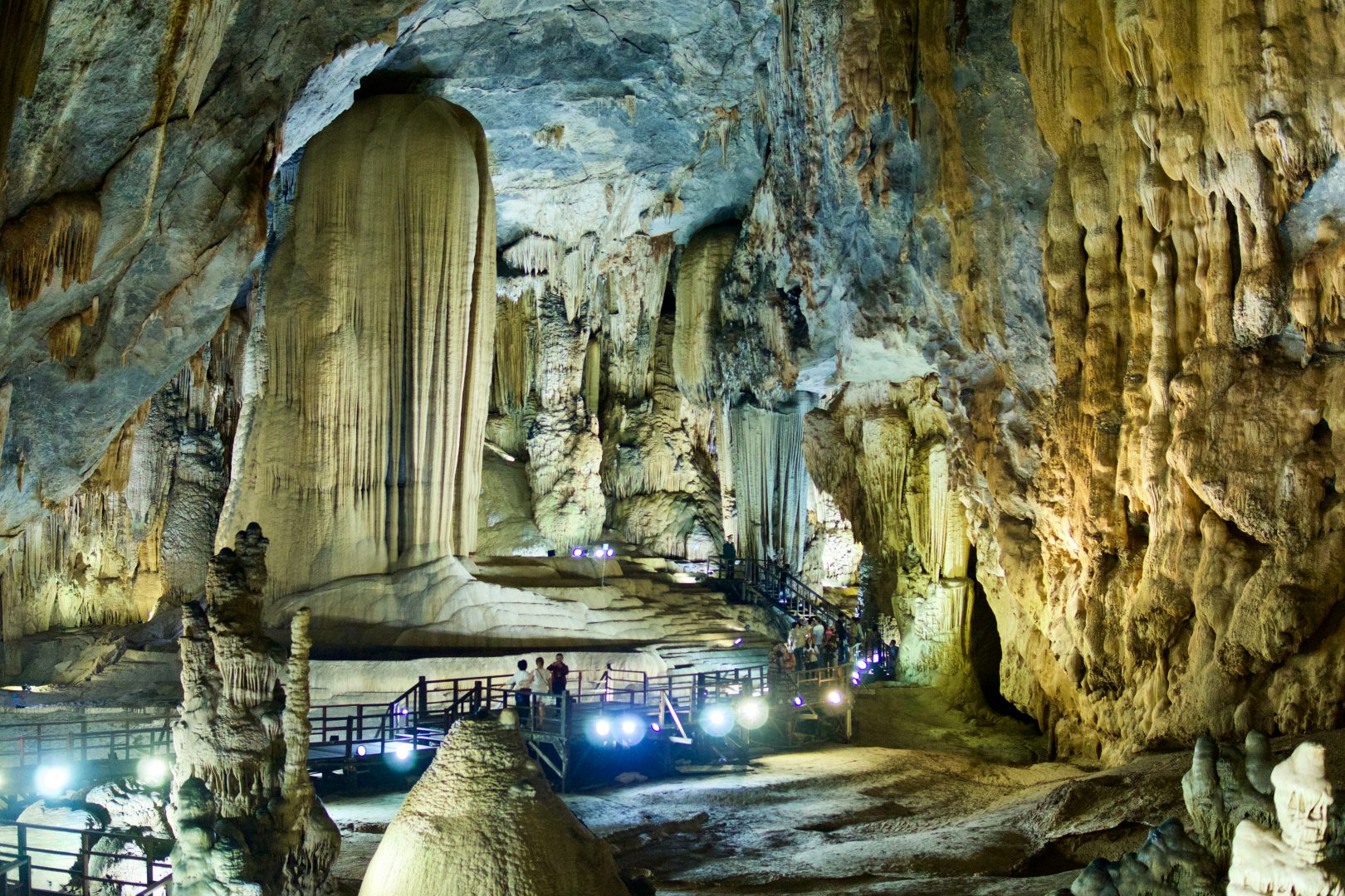 Heute bin ich sehr früh aufgestanden, um vor den chinesischen Reisegruppen zur Paradise Cave zu kommen. Dieses mal wusste ich ja auch den richtigen Weg… Bei Dauernieselregen und kühlen 20 Grad bin ich also wieder durch den Dschungel geknattert. Der Höhleneingang liegt ziemlich weit oben in den Bergen und mitten im dichten Wald, man kann nur bis ungefähr einen Kilometer an den Eingang heranfahren, dann geht es einen wunderschönen Pfad durch den Wald (für diese 600 Meter gibt es für die Gehfaulen eine extra Straße mit Shuttlezug). Ich war tatsächlich komplett alleine, wahrscheinlich sogar der erste Besucher, deswegen durfte ich auch alle frischen Spinnweben auf dem Dschungelpfad mitnehmen.. Die letzten 5oo Meter ging es ziemlich steil den Berg hoch, bis man dann endlich vor einem unscheinbaren Spalt im Berg steht. Über eine gewundene Holztreppe gelangt man hinab in der ersten Raum, der absolut gigantisch ist. Man verliert unter der Erde sofort das Gefühl für Größe und Weite.